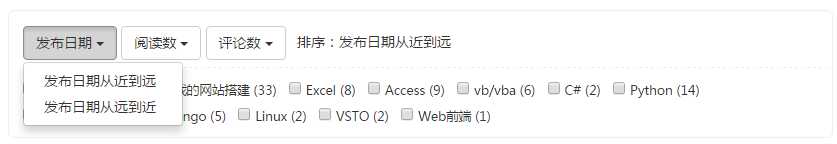 <div class="filter-item"> <div class="btn-group"> <button type="button" class="btn btn-default dropdown-toggle" data-toggle="dropdown"> 发布日期 <span class="caret"></span> </button> <ul class="dropdown-menu" role="menu"> <li><a href="javascript:void(0);"> 发布日期从近到远 </a></li> <li><a href="javascript:void(0);"> 发布日期从远到近 </a></li> </ul> </div> <!--其他下拉框也在这个filter-item的div里面--> </div>