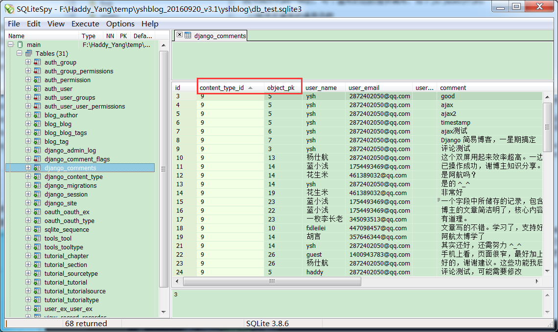 object_pk是对应的博文id值。例如图片第一条记录表示有人在我博文id为5评论了一条“good”。